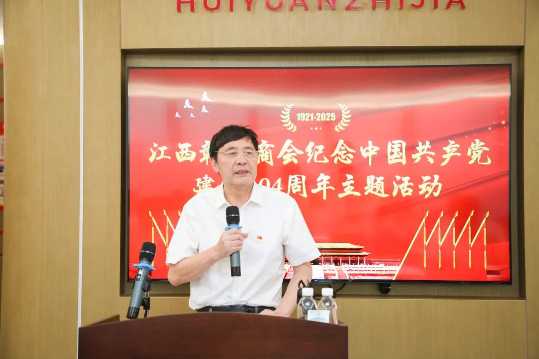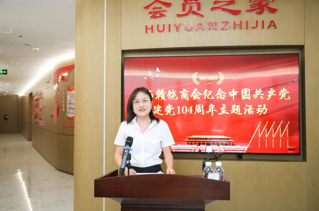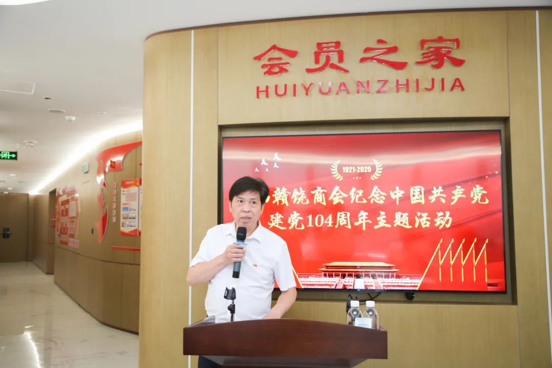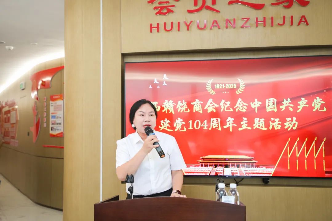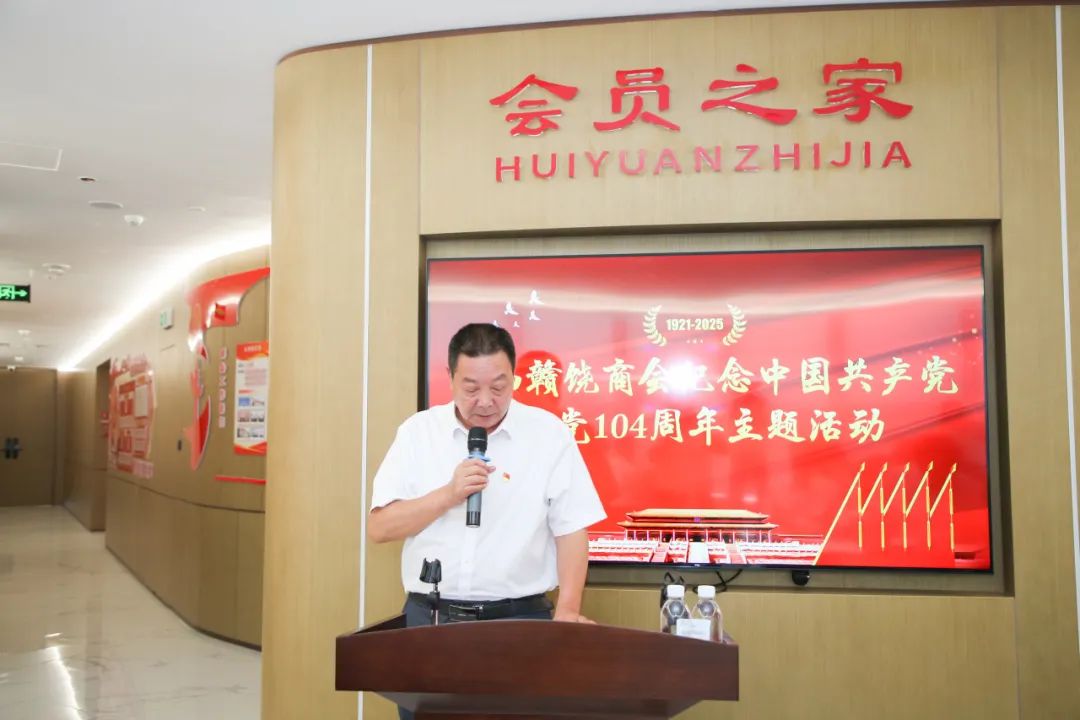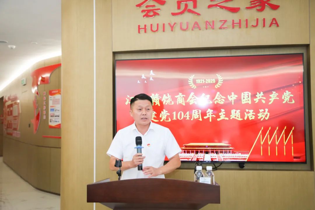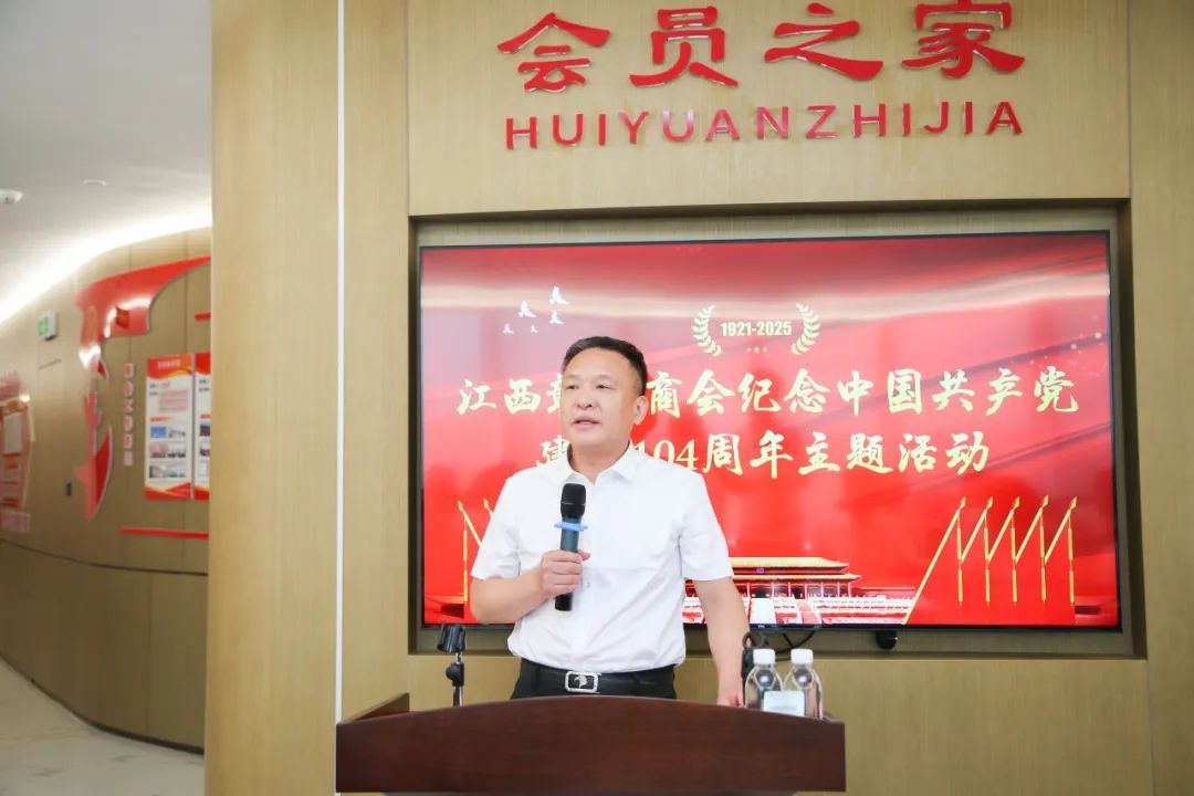 为庆祝中国共产党成立104周年,回顾党的光辉历程,总结党建工作经验,推动商会党建工作再上新台阶,激发广大会员党员的爱党爱国热情和干事创业激情,2025年6月28日下午,我会在商会会员之家举办纪念建党104周年主题活动。会长饶明芳,党委书记饶英奇,轮值会长李东,执行会长汪强辉,执行会长、第二党支部书记刘涛,执行会长聂丁科、罗贤敏,执行会长、南昌市德兴商会党支部书记程顺林,常务副会长兼常务副秘书长李太明,常务副会长程艺江,副会长、第一党支部书记王朝有,副会长、第二党支部副书记毛少华,副会长董阳东、章军明,执行秘书长张承凤,轮值理事兼常务副秘书长吴明珠,理事兼副秘书长邱双军、饶玉兰,会员、第一党支部副书记余珍如以及部分党员、会员参加活动。活动还邀请到南昌市德兴商会党支部代表、南昌市婺源商会党支部代表、南昌市铅山商会党支部代表共同参加。