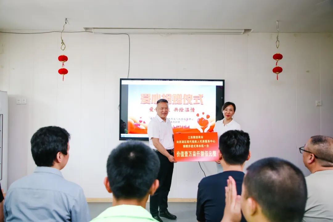 随后,在捐赠仪式上,饶明芳会长代表商会郑重地向西湖区现代残疾人托养服务中心递交了价值17800元的爱心物资捐赠牌。