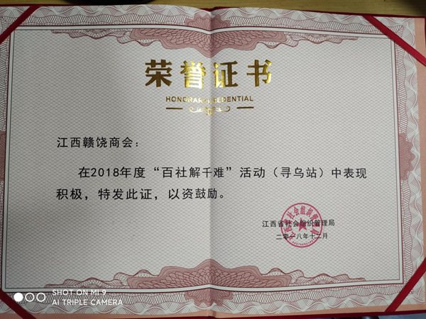 2020年在江西省民政厅、江西省扶贫办公室、江西省社会组织管理局开展的“党建+百社解千难”社会组织助力脱贫攻坚工作中被评为“表现积极单位”和“突出贡献单位”