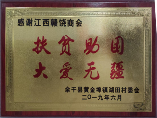 2019年获得由余干县黄金埠镇湖田村委会感谢“扶贫助团大爱无疆”状