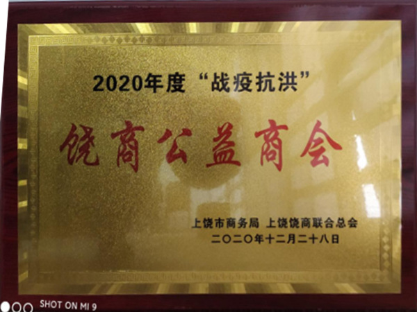2020年由上饶市商务局、上饶饶商联合总会授予年度“战役抗洪”饶商公益商会荣誉