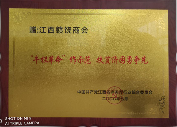 2020年获得由中国共产党江西省商务厅行业综合党委委员会赠江西赣饶商会的"牛栏革命"作示范 扶贫济困勇争先
