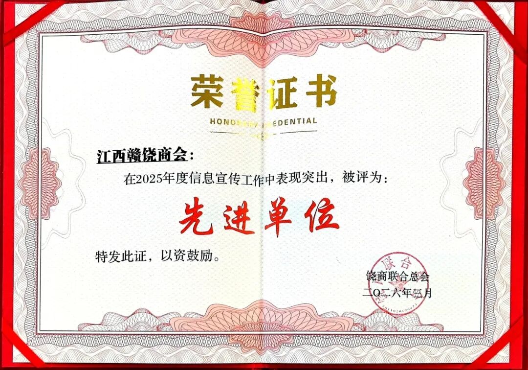 会上,饶商联合总会发布了《关于表扬2025年度信息宣传工作先进单位的通报》。江西赣饶商会凭借出色的宣传工作和扎实的成果,获评2025年度信息宣传工作先进单位。